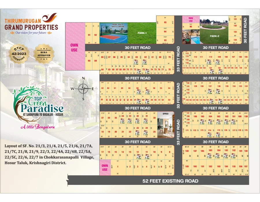 TGP Green Paradise is developed by Thirumurugan Grand Properties, a real estate company with offices in major cities of Tamil Nadu, including Salem, Hosur, Vellore, Coimbatore, Namakkal, and Bengaluru in Karnataka